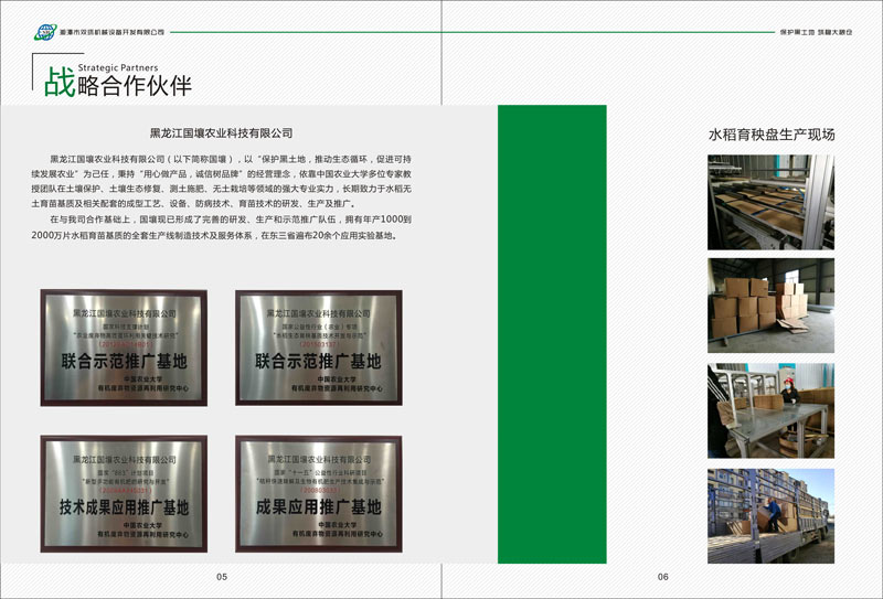 在與我司合作基礎(chǔ)上,國壤現(xiàn)已形成了完善的研發(fā)、生產(chǎn)和示范推廣隊(duì)伍,擁有年產(chǎn)1000到2000萬片水稻育苗基質(zhì)的全套生產(chǎn)線制造技術(shù)及服務(wù)體系,在東三省遍布20余個(gè)應(yīng)用實(shí)驗(yàn)基地。